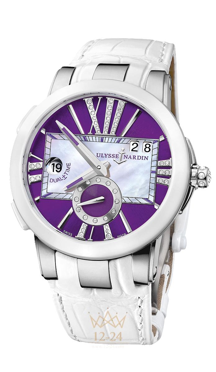 Калибр 11½" UN-24. Автоподзавод, быстрая настройка второго часового пояса, малая секундная стрелка. Корпус из нержавеющей стали диаметром 40мм ,водонепроницаемость 50 метров. Белый/фиолетовый циферблат, римские цифры, декорированные бриллиантами, 49 бриллиантов. Ремешок из кожи аллигатора.
