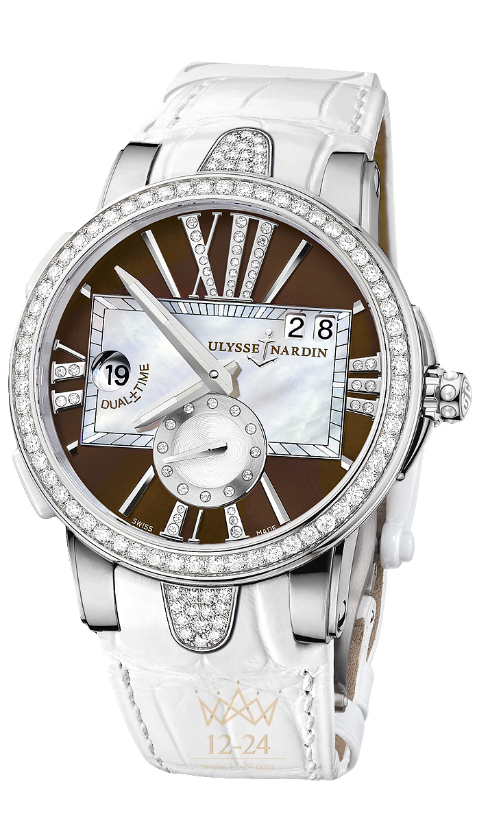 Калибр 11½" UN-24. Автоподзавод, быстрая настройка второго часового пояса, малая секундная стрелка. Корпус из нержавеющей стали диаметром 40мм, инкрустированный 60 бриллиантами ,водонепроницаемость 50 метров. Белый перламутровый центр циферблата, коричневое внешнее кольцо, римские цифры, с 43 бриллиантами. Ремешок из кожи аллигатора.