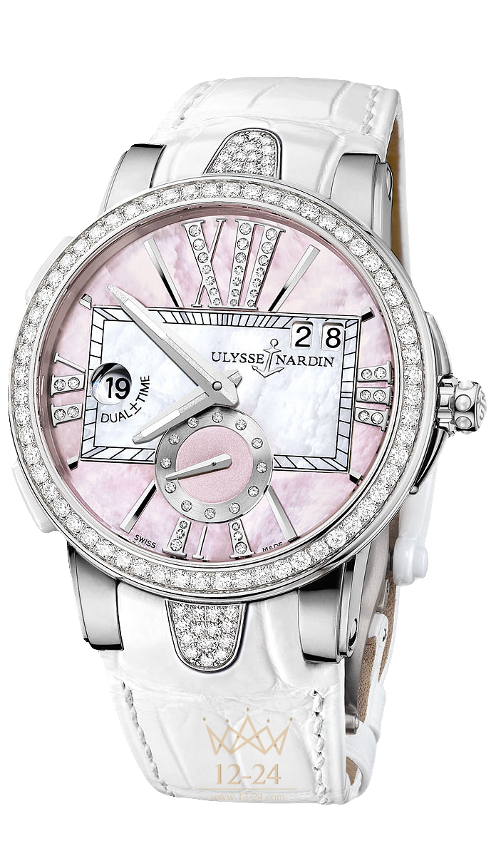 Калибр 11½" UN-24. Автоподзавод, быстрая настройка второго часового пояса, малая секундная стрелка. Корпус из нержавеющей стали диаметром 40мм, инкрустированный 60 бриллиантами ,водонепроницаемость 50 метров. Розовый перламутровый циферблат, римские цифры, с 43 бриллиантами. Ремешок из кожи аллигатора.