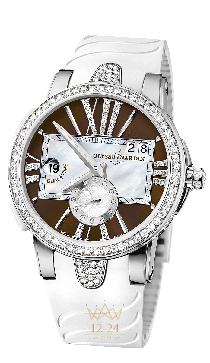 Калибр 11½" UN-24. Автоподзавод, быстрая настройка второго часового пояса, малая секундная стрелка. Корпус из нержавеющей стали диаметром 40мм, инкрустированный 60 бриллиантами ,водонепроницаемость 50 метров. Белый перламутровый центр циферблата, коричневое внешнее кольцо, римские цифры, с 43 бриллиантами. Каучуковый ремешок или керамический браслет с 28 бриллиантами.