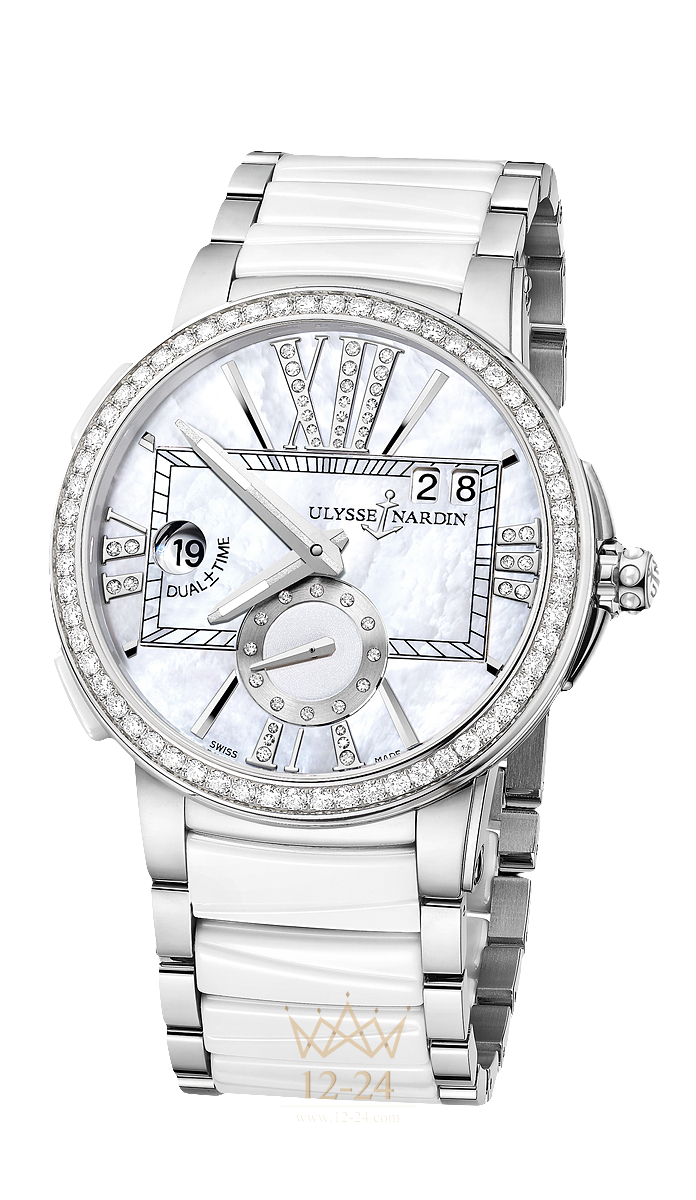 Калибр 11½" UN-24. Автоподзавод, быстрая настройка второго часового пояса, малая секундная стрелка. Корпус из нержавеющей стали диаметром 40мм, инкрустированный 60 бриллиантами ,водонепроницаемость 50 метров. Белый перламутровый циферблат, римские цифры, с 49 бриллиантами. Браслет из нержавеющей стали с керамической раскладывающейся застежкой.