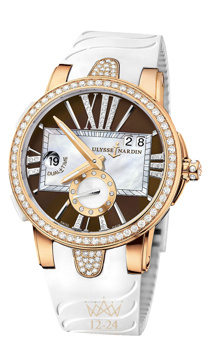 Калибр 11½" UN-24. Автоподзавод, быстрая настройка второго часового пояса, малая секундная стрелка. Корпус из 18-каратного розового золота диаметром 40мм, инкрустированный 60 бриллиантами ,водонепроницаемость 50 метров. Белый перламутровый центр циферблата, коричневое внешнее кольцо, римские цифры. Каучуковый ремешок или керамический браслет с 28 бриллиантами.