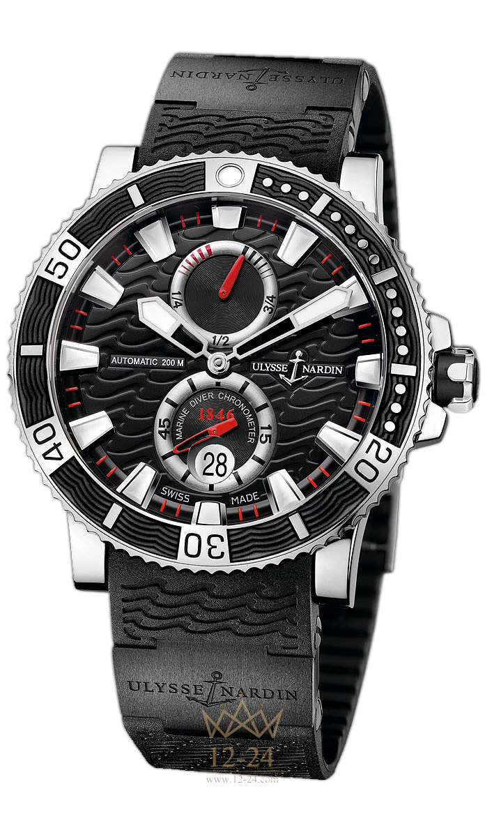 Калибр 11½" UN-26. Автоподзавод, малые секундные стрелки, индикация запаса хода. Корпус из титана/стальной корпус диаметром 45мм, водонепроницаемость 200 метров, черный циферблат, каучуковый ремешок или керамический браслет.
