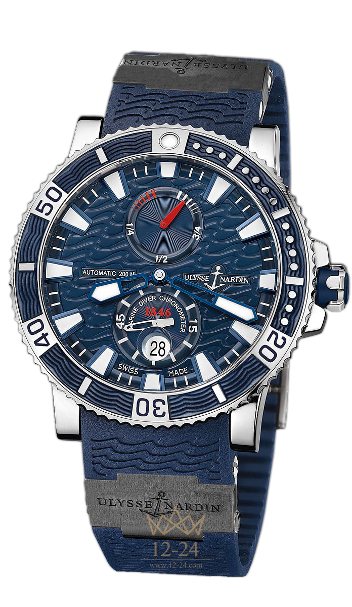 Калибр 11½" UN-26. Автоподзавод, малые секундные стрелки, индикация запаса хода. Корпус из титана/стальной корпус диаметром 45мм, водонепроницаемость 200 метров, голубой циферблат, каучуковый ремешок или керамический браслет.