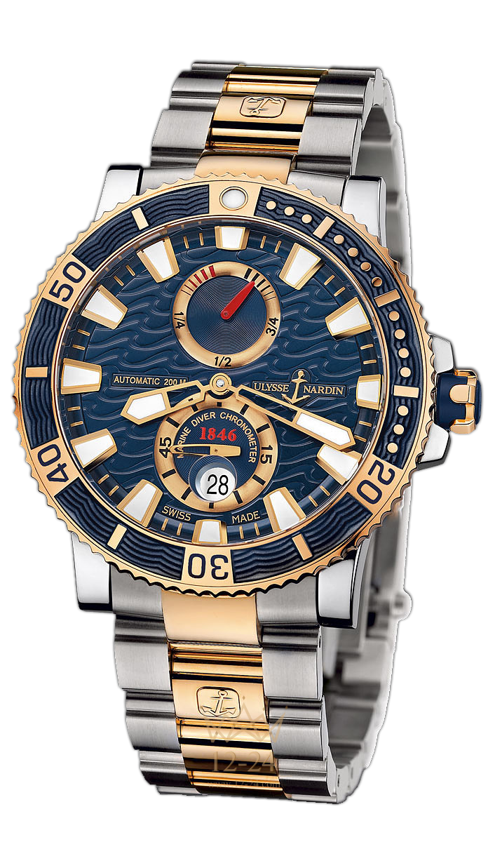 Калибр 11½" UN-26. Автоподзавод, малые секундные стрелки, индикация запаса хода. Корпус из титана/корпус из золота диаметром 45мм, водонепроницаемость 200 метров, голубой циферблат, браслет из 18-каратного золота.