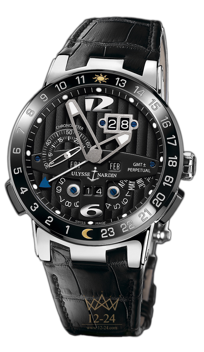 Это часы с высокотехнологичным вечным календарем, а также с индикацией времени второго часового пояса. Корпус из 18-каратного белого золота диаметром 43мм. Черный циферблат. Калибр 13¼" UN-32. Водонепроницаемость 100 метров. Ремешок из кожи аллигатора.