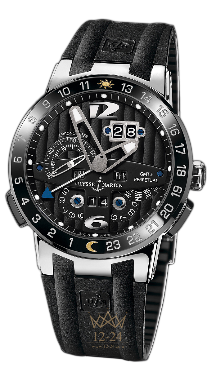 Это часы с высокотехнологичным вечным календарем, а также с индикацией времени второго часового пояса. Корпус из 18-каратного белого золота диаметром 43мм. Черный циферблат. Калибр 13¼" UN-32. Водонепроницаемость 100 метров. Каучуковый ремешок или керамический браслет.