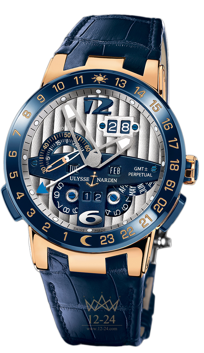 Это часы с высокотехнологичным вечным календарем, а также с индикацией времени второго часового пояса. Корпус из 18-каратного розового золота/керамический корпус диаметром 43мм. Голубой циферблат. Калибр 13¼" UN-32. Водонепроницаемость 100 метров. Ремешок из кожи аллигатора.