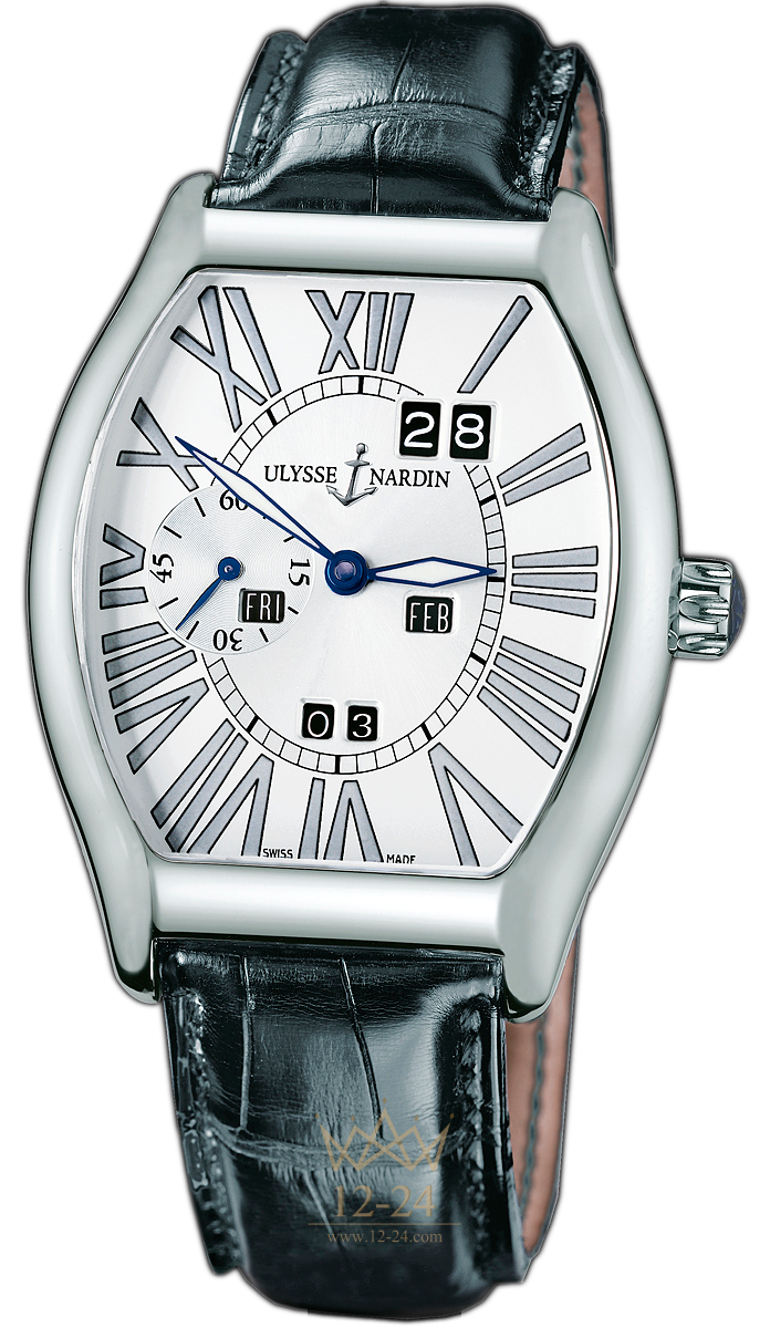 Калибр 13¼" UN-33. Вечный календарь, автоподзавод. Корпус из 18-каратного белого золота размером 38X43мм. Водонепроницаемость 50 метров. Серебристый циферблат. Ремешок из кожи аллигатора.