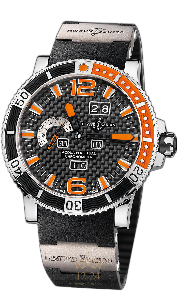 Калибр 13¼" UN-33. Вечный календарь, автоподзавод, индикация времени второго часового пояса. Корпус из титана/стальной корпус диаметром 45мм. Водонепроницаемость 200 метров. Черный циферблат. Каучуковый ремешок/браслет из титана/стальной браслет.