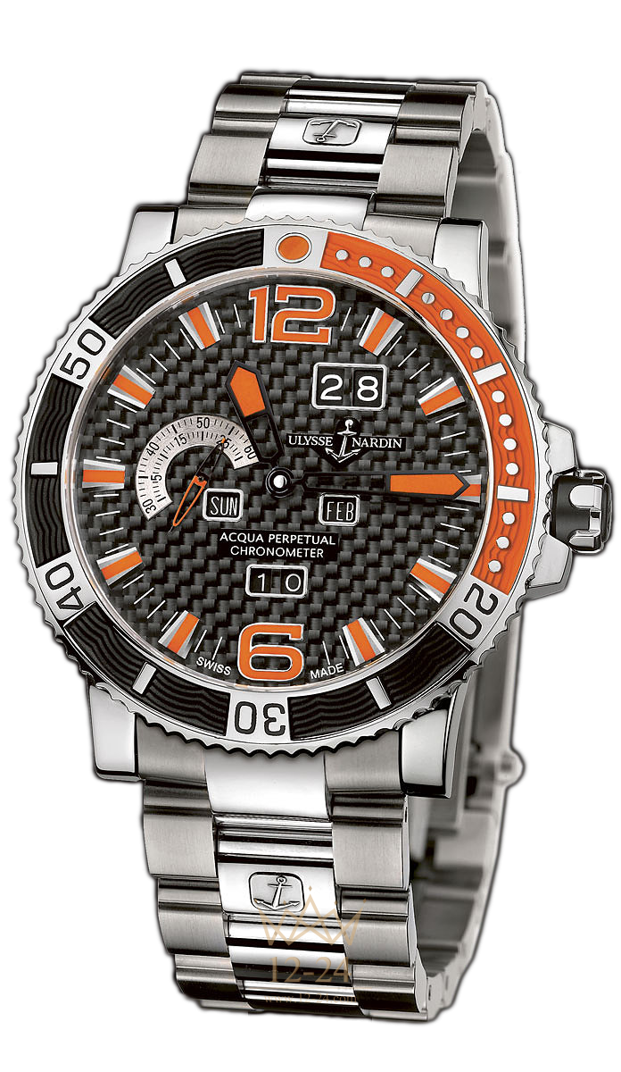 Калибр 13¼" UN-33. Вечный календарь, автоподзавод, индикация времени второго часового пояса. Корпус из титана/стальной корпус диаметром 45мм. Водонепроницаемость 200 метров. Черный циферблат. Каучуковый ремешок/браслет из титана/стальной браслет.