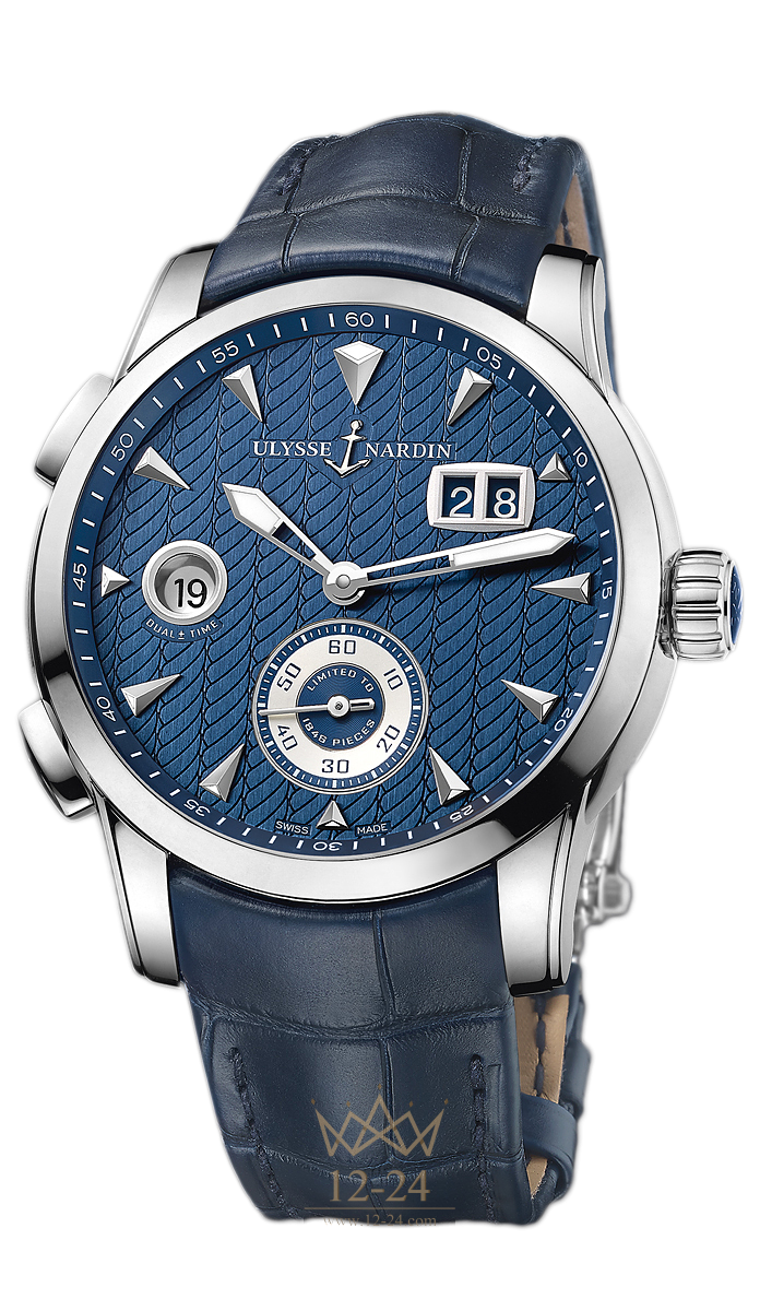 Новая версия часов Dual Time Manufacture с ярким синем циферблатом, украшенный узором в виде очертания каната. Серия ограничена - выпущено всего 1846 экземпляров. Калибр UN-334. Автоподзавод, быстрая настройка второго часового пояса, малая секундная стрелка, корпус из нержавеющей стали диаметром 42мм, водонепроницаемость 30 метров. Голубой циферблат. Ремешок из кожи аллигатора.