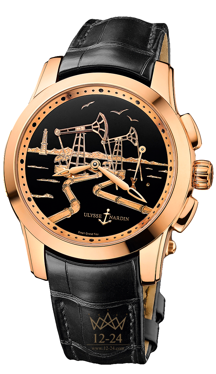 UN Hourstriker Oil Pump – это дань уважения нефтедобывающей промышленности. Циферблат, украшенный изящно вырезанными из золота фигурками на фоне черной эмали, демонстрирует слаженную работу нефтяных насосов, выкачивающих будущее топливо, необходимое всем жителям Земли. Фигурки насосов являются «жекамарами» - при первых звуках репетира они оживают и движутся в такт ударам гонга, отбивающего часы. Сложный в конструкции, репетир Hourstriker Oil Pump весьма прост в использовании: активация и деактивация репетира осуществляется посредством нажатия пушера. Для украшения циферблата были использованы техники эмалирования и ручной гравировки. Сначала мастер-гравер создает основу из золота с обозначенными на ней пейзажем и фигурами. Затем мастер-эмальер заполняет углубление оригинальной черной эмалью. После обжига в печи и выравнивания поверхности эмали, которая после этого начинает сиять, циферблат вновь возвращается граверу, который наносит окончательные детальные гравировки. Благодаря этой сложной процедуре достигается восхитительное правдоподобие изображения на циферблате! Модель предлагается в 42-миллиметровом корпусе из 18-каратного розового золота. Серия ограничена – выпущено 18 экземпляров.
