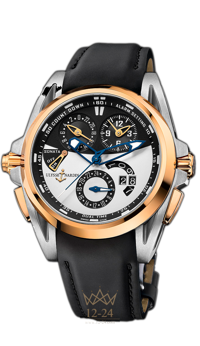 Часы серии Sonata оснащены системой индикации времени второго часового пояса с механизмом быстрой коррекции времени с помощью кнопок. На циферблате часов расположены три дополнительных циферблата: индикатор времени второго часового пояса с мгновенным переключением, индикатор времени установки будильника и указатель обратного отсчета для будильника. Будильник оснащен функцией мелодичного «кафедрального» звона. Калибр UN-66. Часы выпущены в корпусе из титана и розового золота на практичном каучуковом ремешке.