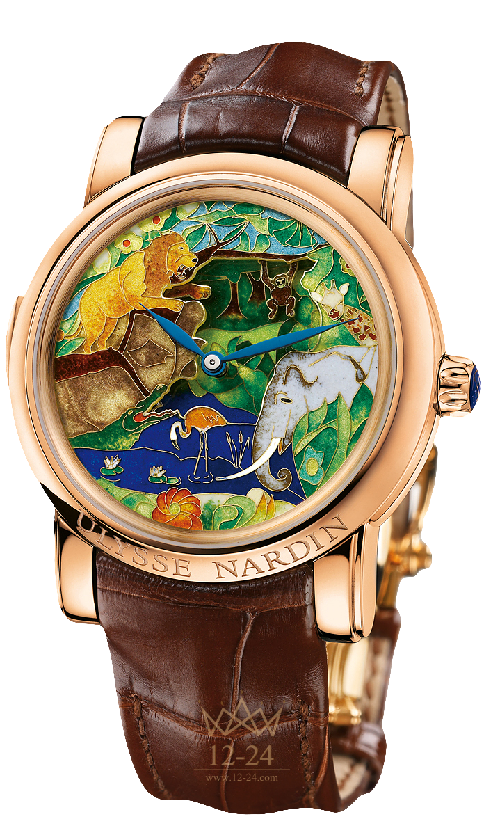 Корпус из 18-каратного розового золота, диаметром 42 мм, эмалированный циферблат с рисунком "Safari". Калибр UN-72, ручной завод, водонепроницаемость 30 метров, ремешок из кожи аллигатора.
