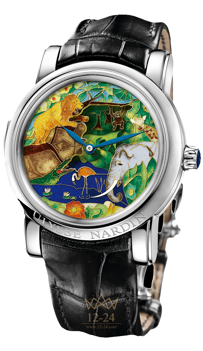 Корпус из платины 950 пробы, диаметром 42 мм, эмалированный циферблат с рисунком "Safari". Калибр UN-72, ручной завод, водонепроницаемость 30 метров, ремешок из кожи аллигатора.