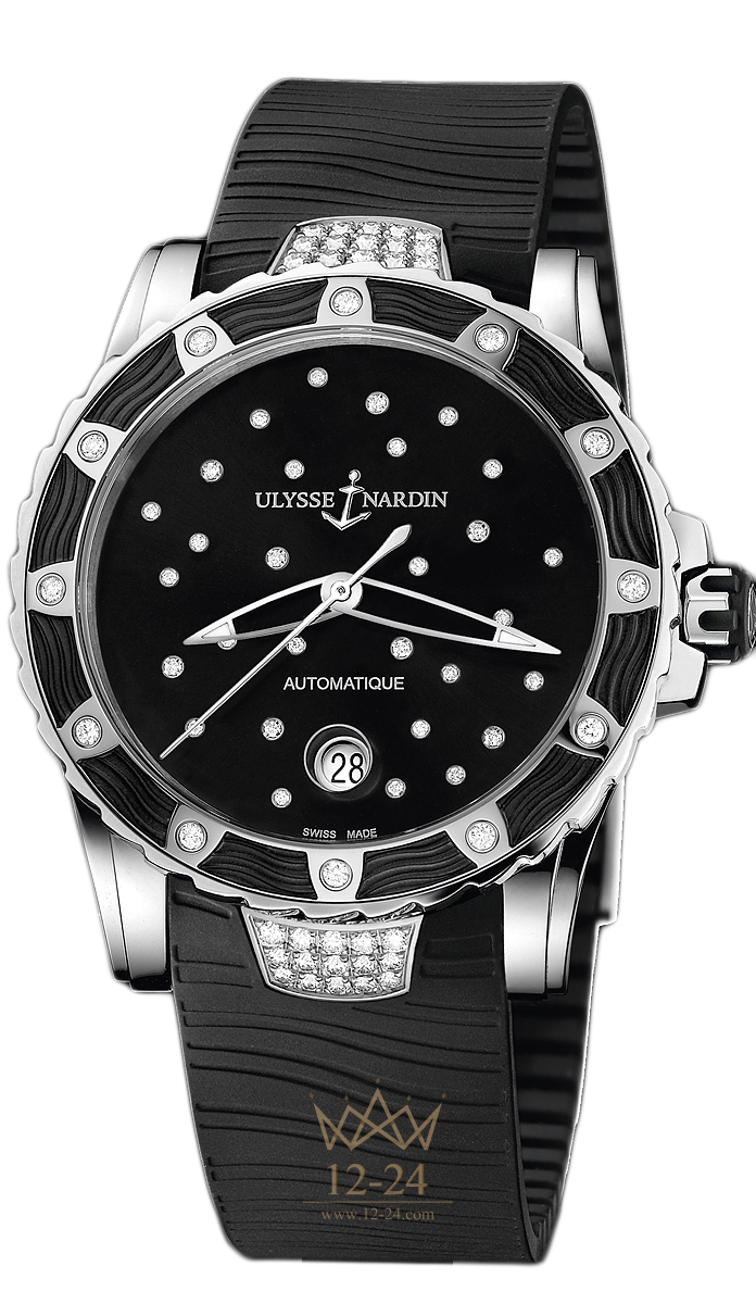 НАРУЧНЫЕ ЧАСЫ Lady Diver 2014. Калибр 11½" UN-815. Корпус из нержавеющей стали диаметром 40мм, чёрный циферблат, автоподзавод, водонепроницаемость 100 метров. Каучуковый ремешок или браслет из титана с 30 бриллиантами.
