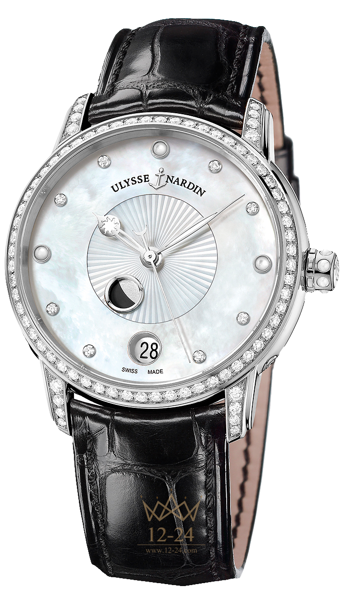 Прекрасные часы для женщин из коллекции Classico Luna сочетают в себе классическую сдержанность и изящные усложнения в виде указателя фаз луны в небольшой круглой апертуре, которая движется по кругу, совершая один оборот за 12 часов. 8 бриллиантовых часовых отметок разбросаны по перламутровому циферблату как звезды. У отметки «6 часов» установлено окошко с датой. Функции индикации секунд, часов и минут, а также даты и лунных фаз обеспечивает автоматический механизм UN-829 с запасом хода 42 часа. Этот калибр был разработан совместно с известным часовым мастером Людвигом Охслином, автором знаменитой «Трилогии времени» от Ulysse Nardin. Часы выпускаются с водонепроницаемостью до 50 м и с сапфировым стеклом. Стальной корпус, ремешок из кожи аллигатора.