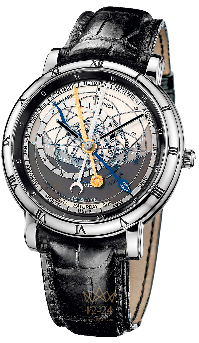 Механизм автоматический, Калибр UN-99. Размеры корпуса 41 мм. Корпус платина 950. Вечный календарь. Функции часы, минуты, месяц, знак зодиака, положение планет относительно Земли и Солнца, вращающаяся вокруг Земли Луна. Циферблат черный. Запас хода 40 часов. Ремешок кожа аллигатора с платиновой вставкой.