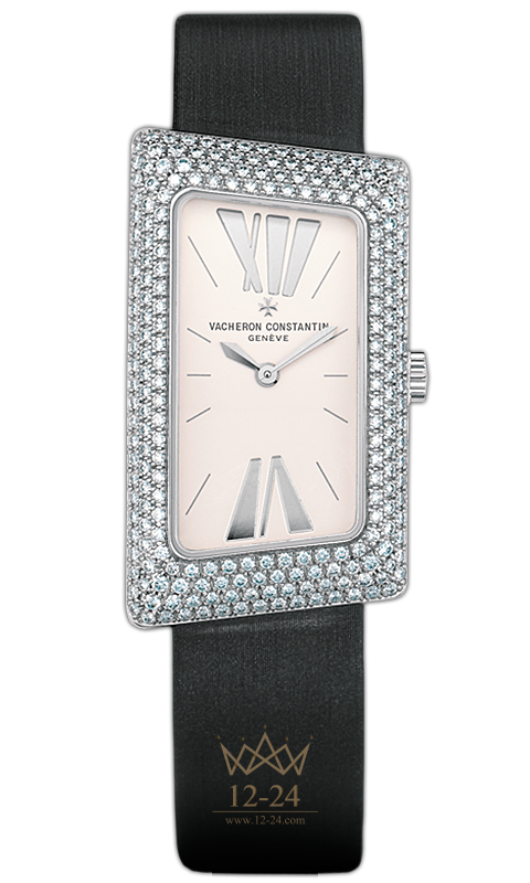 Данная классическая модель с крупными римскими цифрами "12" и "6" выдержана в эстетике ар-деко, ее корпус из белого золота наряжен в "оправу" из бриллиантов ( 257 бриллиантов на корпусе общим весом 1,38 карата ).