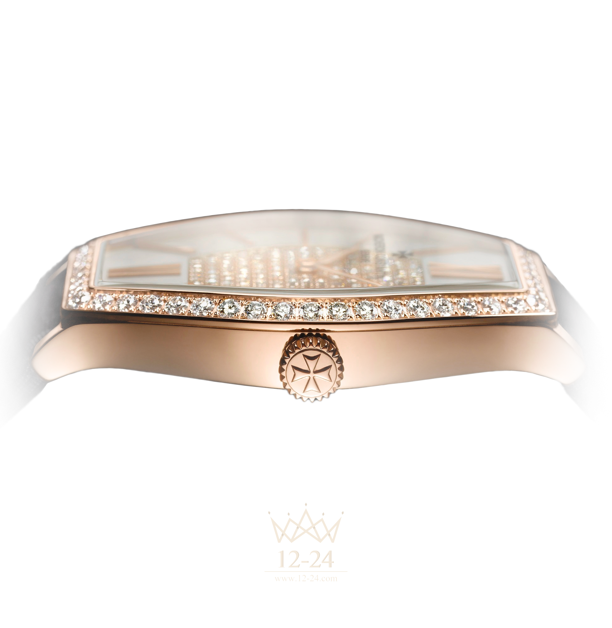 Часы Vacheron Constantin Malte Lady выпущены в корпусе тонно из розового золота. Размер составляет 28,4 мм х 38,6 мм х 7,28 мм, водонепроницаемость 30 м, с безелем из 50-ти белых бриллиантом 0.96 ct. Внутри корпуса установлен кварцевый механизм, Калибр 1202. На серебристом циферблате, с 142-мя белыми бриллиантами 0.59 ct. отображаются часы, минуты. Часы комплектуются атласным ремешком с вставкой из розового золота.