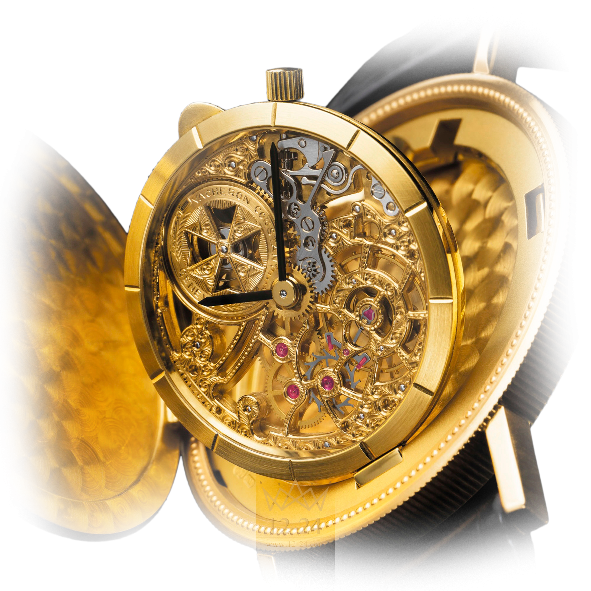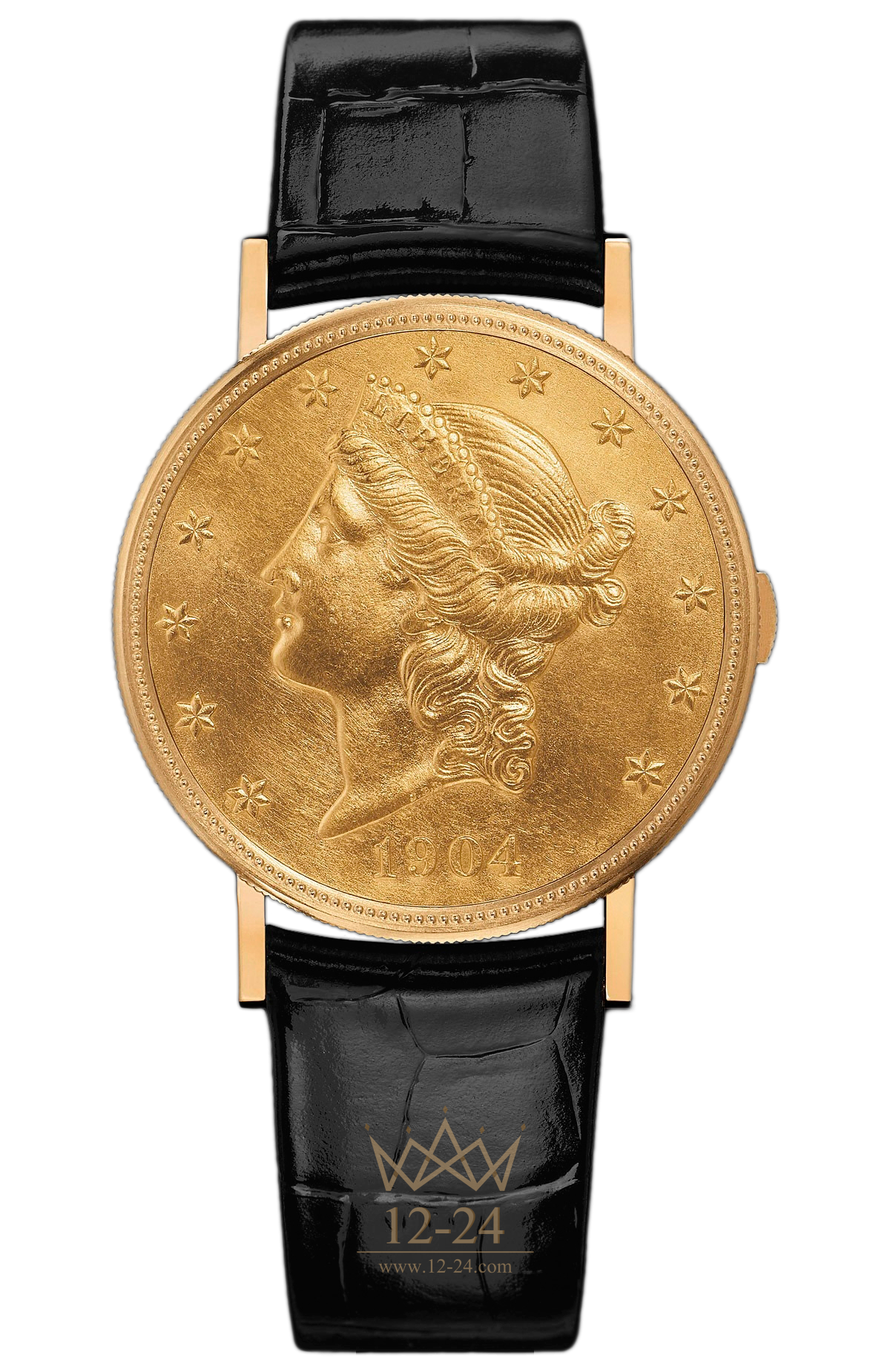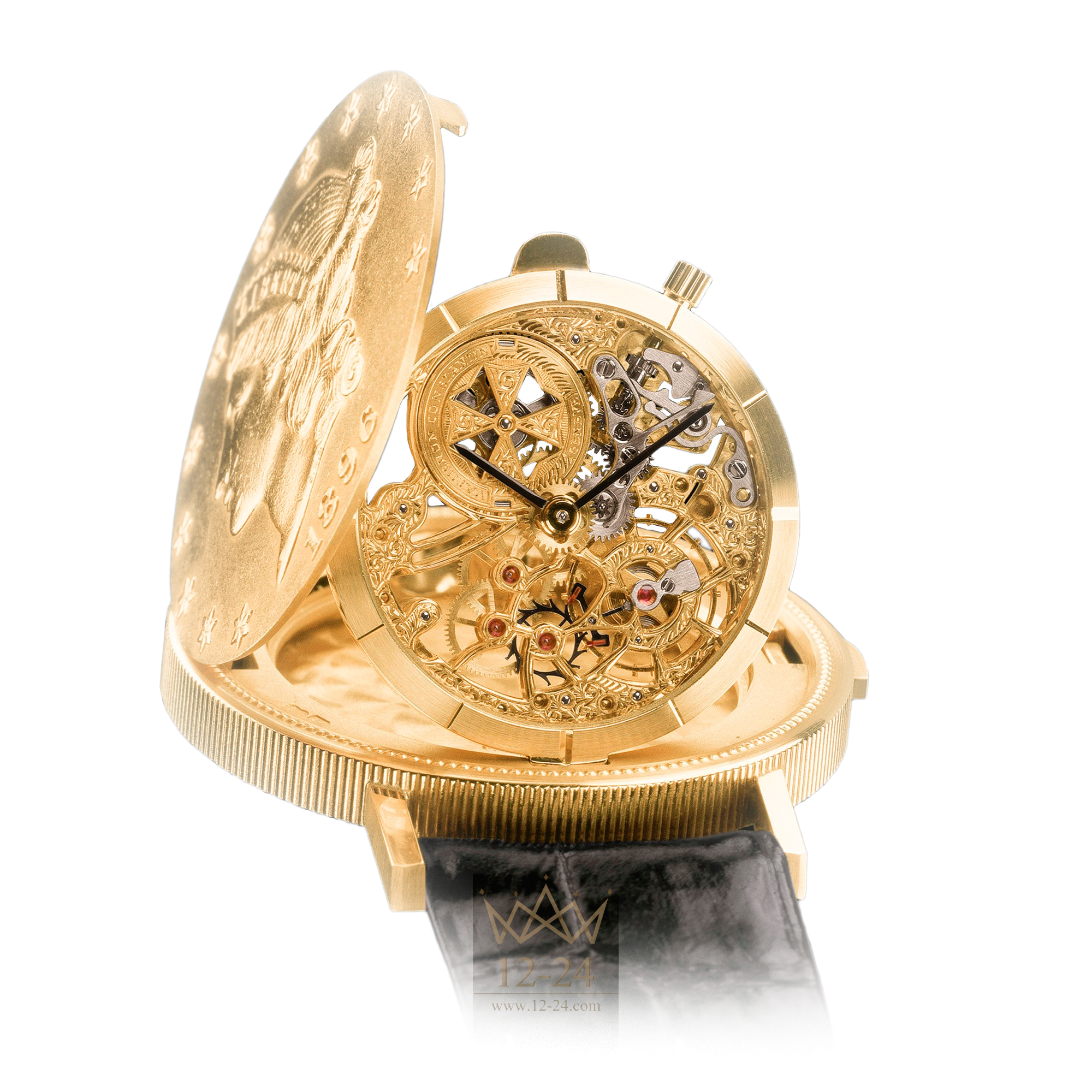 После создания шедевров из золота и бриллиантов Vacheron Constantin решили пойти дальше и выпустили наручные часы, полностью спрятанные внутри настоящей монеты в 20 долларов. Одна из монет выполняет роль корпуса, а вторая разрезана и установлена как крышка часов. Однако самое главное творение мастеров спрятано внутри монеты. Еще в 1955 году Vacheron Constantin вызвали ажиотаж в часовом мире, представив новый калибр 1003, который стал самым тонким в мире часовым механизмом (1.64 мм). Затем, в 1970-х годах, бренд решил скелетировать этот превосходный механизм, который таким образом получил название 1003 SQ. Именно этот калибр с ручным заводом и индикацией часов и минут установлен в данной модели. Неудивительно, что он был отмечен престижным Женевским клеймом. Компания Vacheron Constantin является одним из немногих производителей, которые занимаются серийным выпуском скелетонов любой сложности, сохраняя при этом высочайшие стандарты качества обработки.