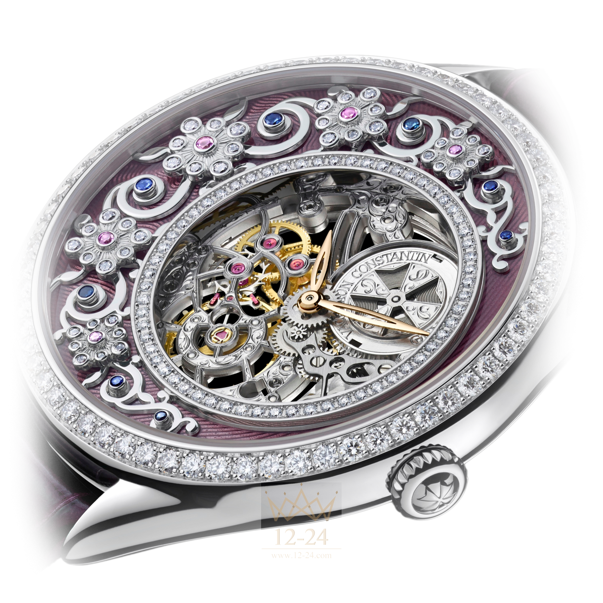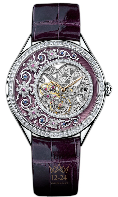 Vacheron Constantin Metiers d'art Fabuleux Ornements French lace - это впечатляющая модель, созданная специально для женщин. Это демонстрация безграничной свободы творчества от Vacheron Constantin! В основу коллекции легли мечты о дальних странах и открытость по отношению к разным культурам мира — одна из ценностей Дома Vacheron Constantin. Циферблат данной модели выпонен в стиле французского кружева - гильошированный циферблат, нанесенный вручную узор и прозрачная эмаль Grand Feu, открытый механизм часовой платины из золота 18 карат, украшенный синими и розовыми сапфирами и бриллиантами (13 сапфиров общей массой приблизительно 0,06 карата и 40 бриллиантов круглой огранки общей массой приблизительно 0,13 карата). Десять мастеров работали над данной моделью. Все детали этой идеальной, легкой словно перышко композиции были фальцованы, украшены и оформлены вручную в традиционной манере. Декор лицевой части механизма точен до десятых долей миллиметра, в то время как задняя крышка часов Vacheron Constantin — сдержанная и элегантная — фальцована и расписана вручную. Все это великолепие крепится на ремешке из кожи аллигатора с вставкой из белого золота.