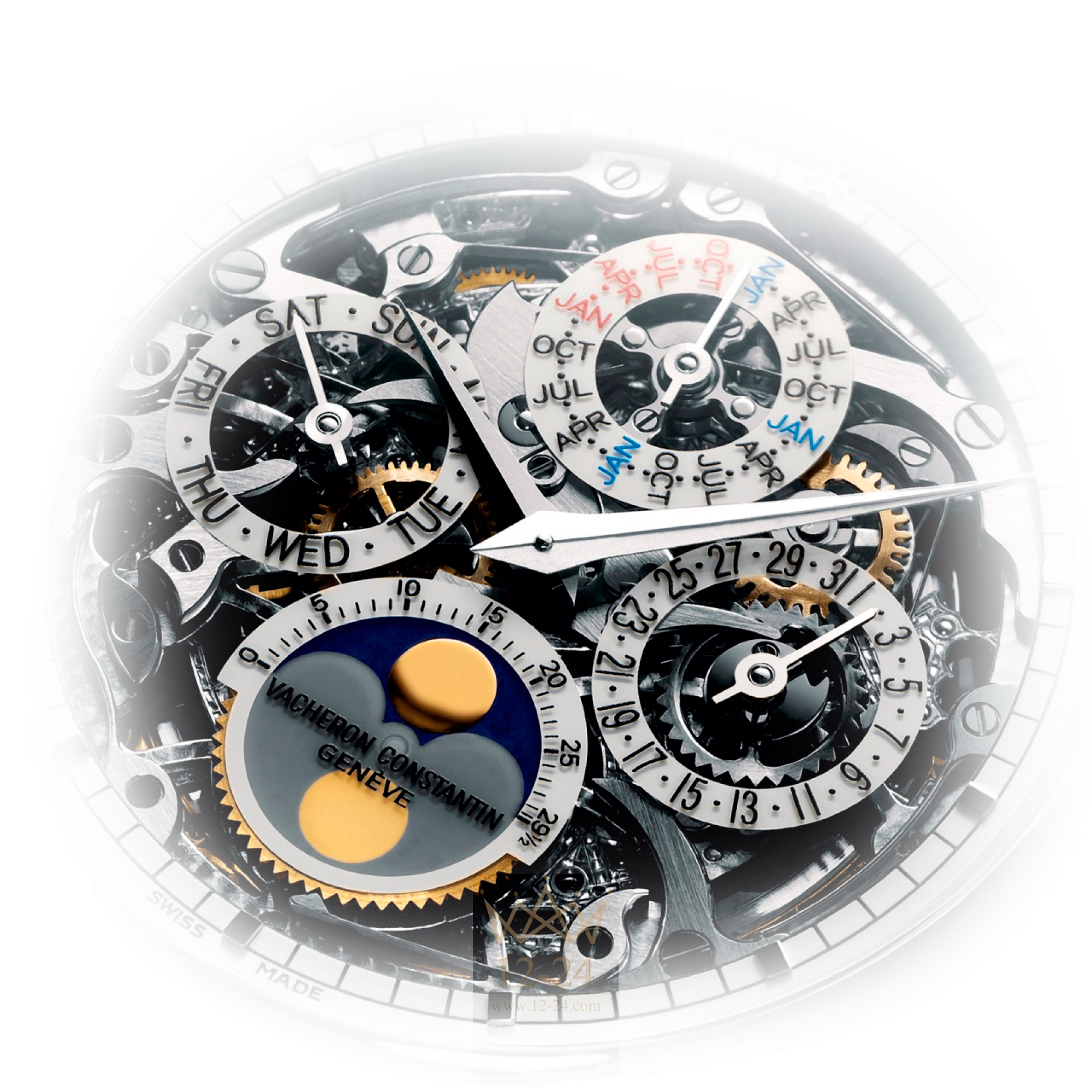 Прозрачный циферблат, на котором расположены дополнительные циферблаты даты, дня недели, месяца и фаз луны, беспрепятственно позволяет любоваться механизмом этих часов. Калибр 1120 qp sq с сертификацией - Женевское клеймо, камни - 36 рубинов. Корпус выполнен из платины, диаметром 39 мм и толщиной 8.82 мм. Запас хода приблизительно 40 часов. Водонепроницаемость 30 м. Стекло - сапфировое с анти-бликовым покрытием. Поставляется на ремешке из кожи аллигатора со стандартной платиновой застежкой.