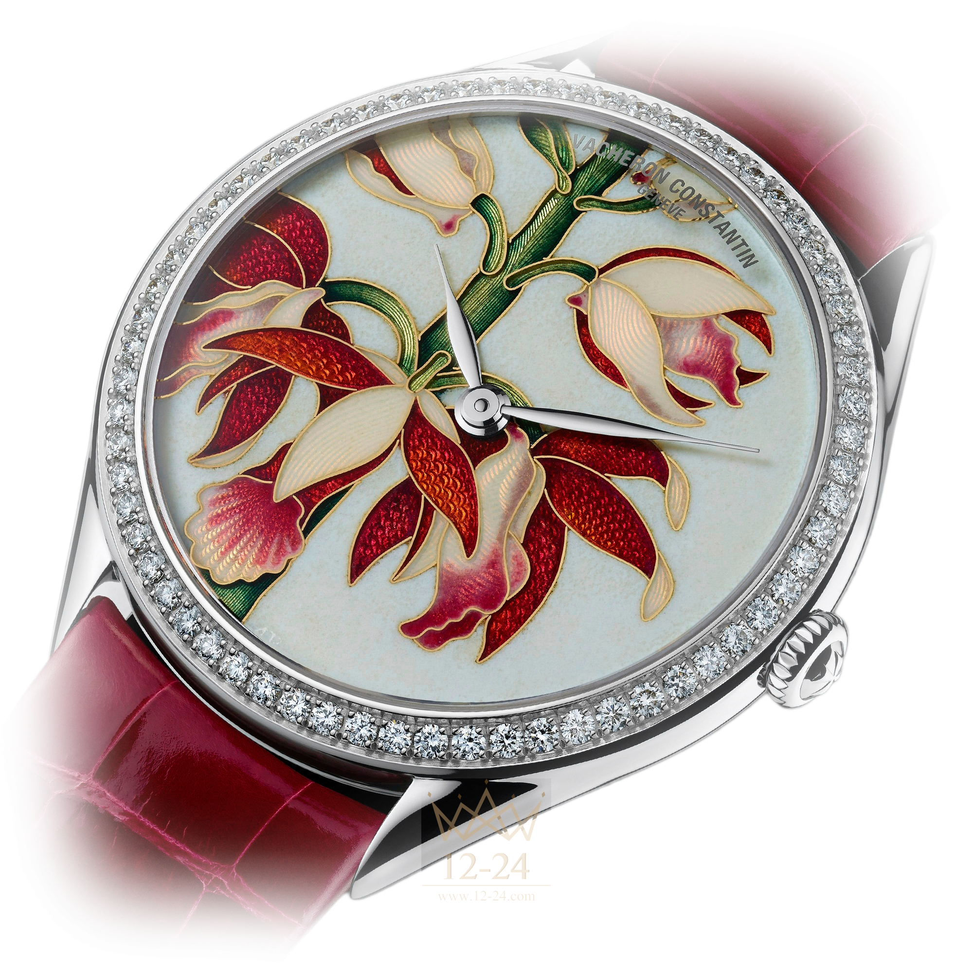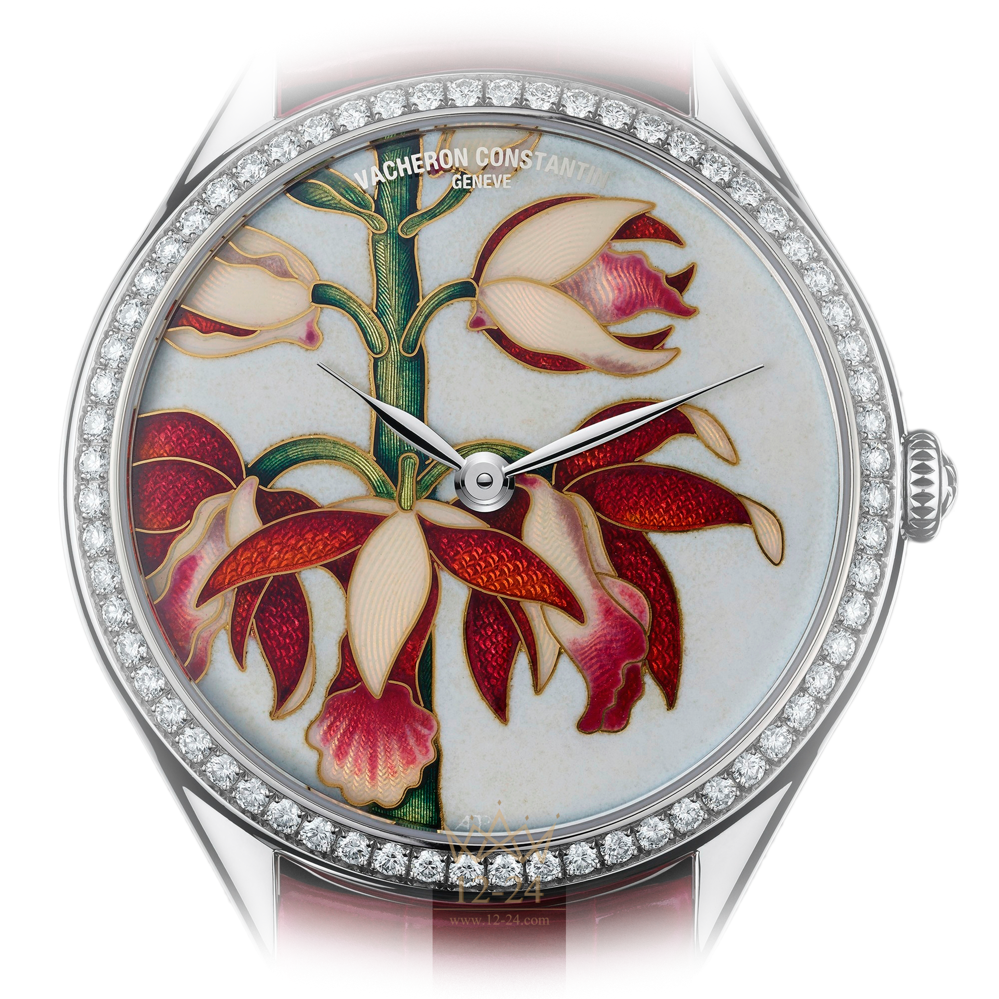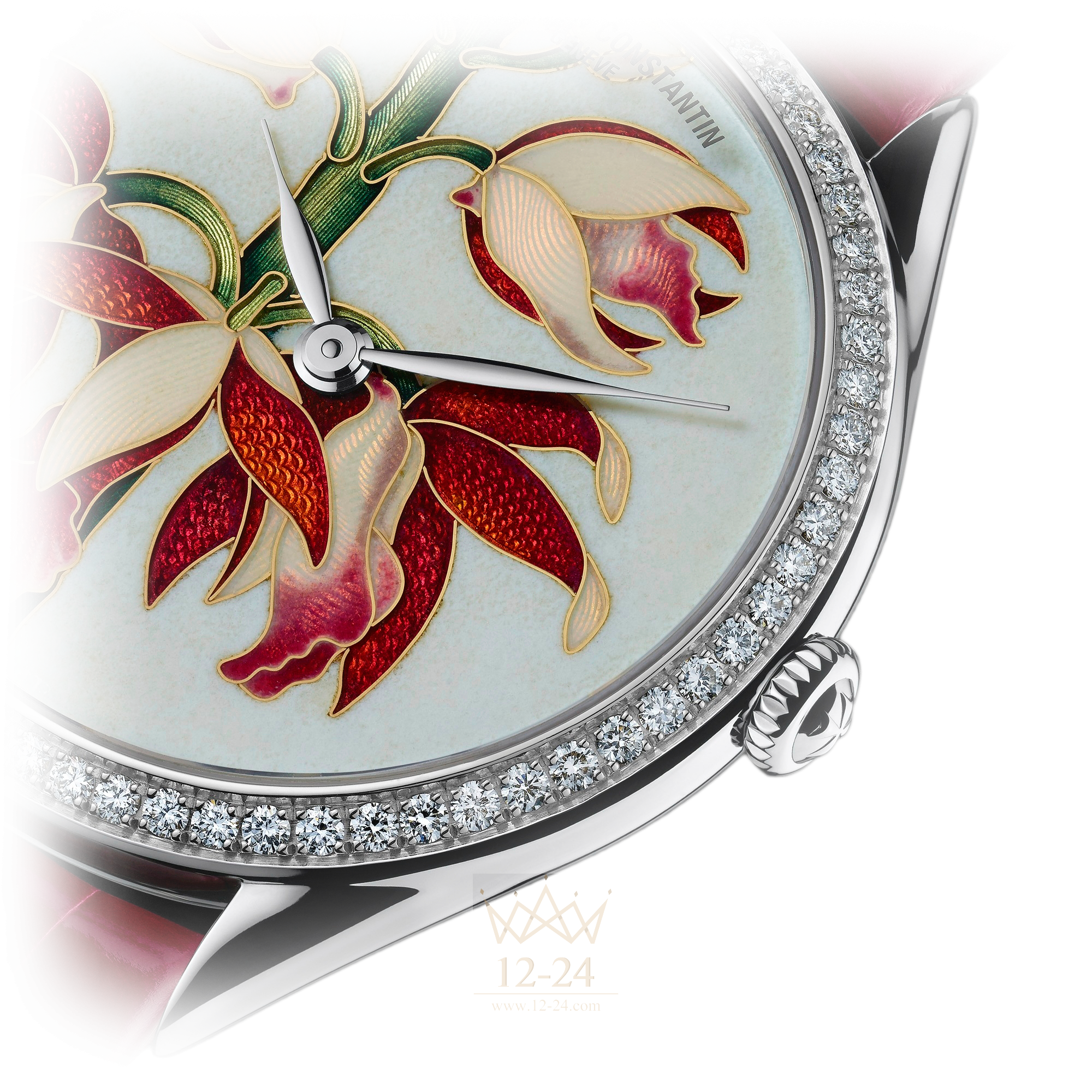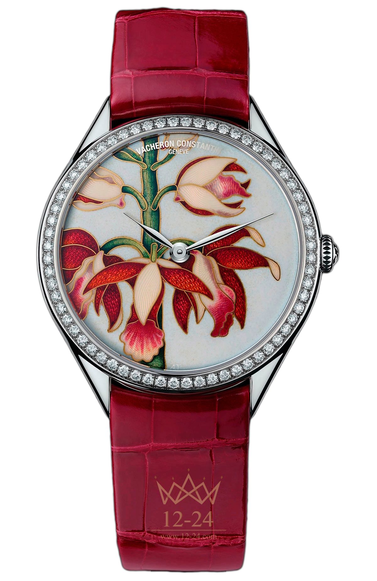 Цветочная трилогия Métiers d’Art Florilège ясно дает понять, что между мануфактурой Vacheron Constantin и художественными искусствами — métiers d’art — были установлены самые тесные взаимоотношения. Настолько тесные, что исконно часовой мануфактуре удается побить ювелирные дома, выходящие на часовой рынок, на их же поле. Винтажные иллюстрации для циферблатов были кропотливо перенесены из книги XVIII века «Ботанические иллюстрации: экзотическая флора» (The Temple of Flora) авторства англичанина Роберта Джона Торнтона. На первом этапе работы специалист по гильоше тонкими и нежными движениями наносит линии толщиной в десятую долю миллиметра, чтобы создать объемный симметричный рисунок. Затем вступает в дело специалист по перегородчатой эмали, чья техника также довольно сложна и трудоемка: процесс нанесения эмали и прижигания ее в печи при 800 градусах необходимо повторить несколько раз, чтобы эмаль приобрела глубокий цвет и прозрачность. На циферблатах красуются три растения: лилия, стрелиция королевская и китайская орхидея, а рант каждых часов украшают 64 круглых бриллианта. В ультратонкий корпус из белого золота заключен калибр 4400 с ручным заводом. Серия ограничена – доступно всего 20 экземпляров.