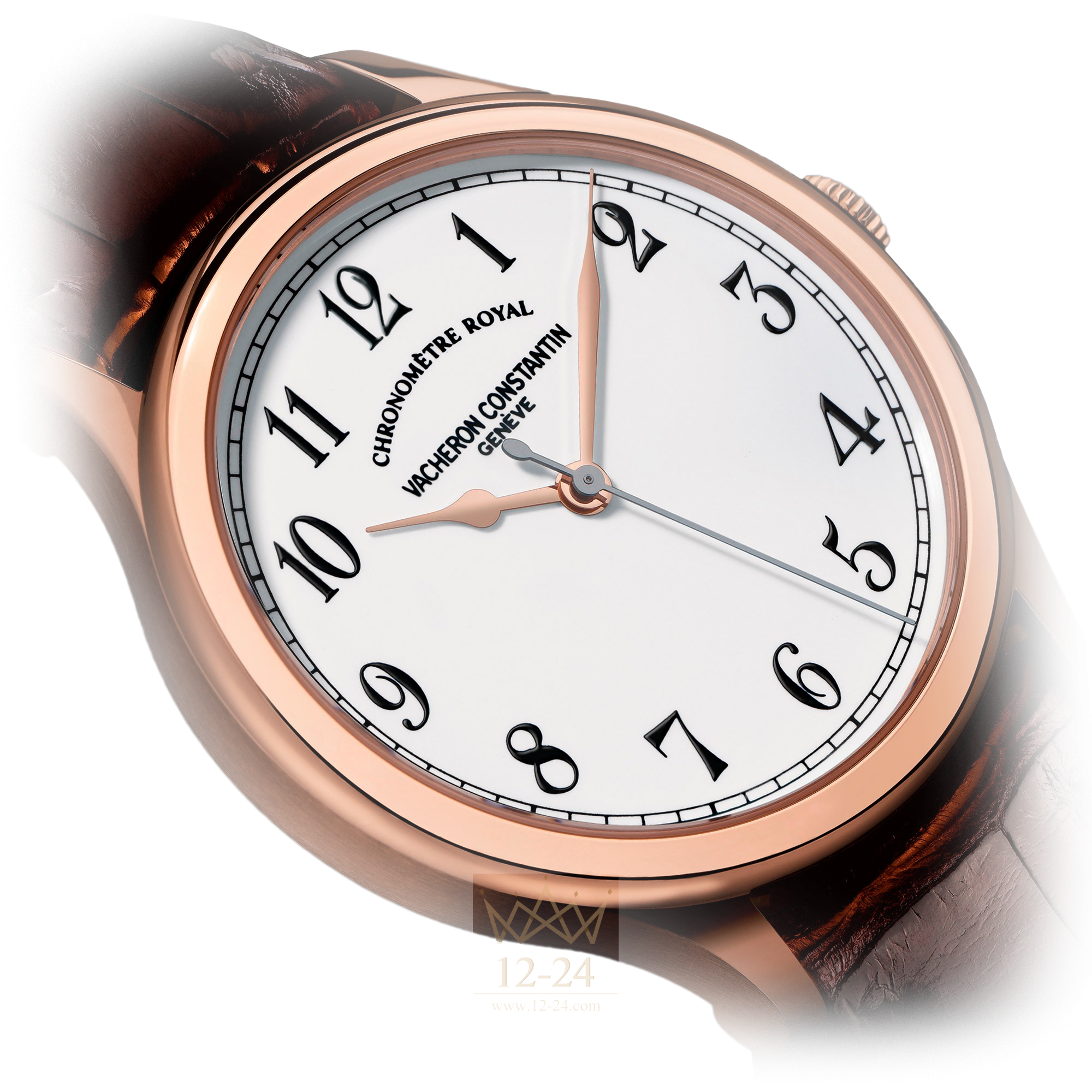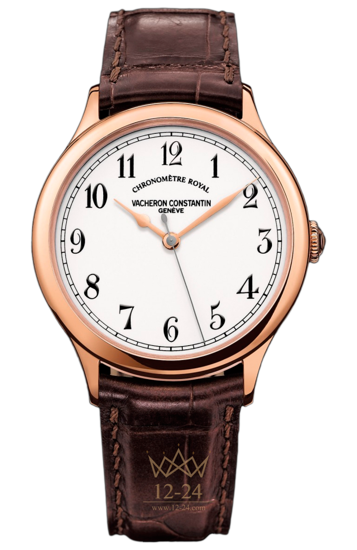 Как и в оригинальной модели, дополнительный счетчик минут, внешним кругом охватывающий циферблат, вносит свой завершающий штрих. Торговый знак “Chronomètre Royal Vacheron Constantin Genève”, расположенный в верхней части круга, как и сто лет назад, увенчивает название бренда Vacheron Constantin Genève у цифровой метки 12 часов. Грушевидные часовые и минутные стрелки из 18-каратного золота тоже соответствуют базовой модели часов, созданной женевской мануфактурой. Калибр 2460 SCC, 27 рубиновых камней, частота: 4 Гц (28'800 полу-колебаний/час), Женевское клеймо. Запас хода: 40 часов. Часы, минуты, центральная секундная стрелка. Циферблат с белой эмалью, выполненной в технике "Grand Feu". Сертификация Официального швейцарского бюро по контролю хронометров. Сапфировое стекло, устойчивое к царапинам. Корпус из золота розового цвета. Ремешок из кожи миссисипского аллигатора. Размер корпуса: диаметр 39 мм, толщина 9,25 мм.