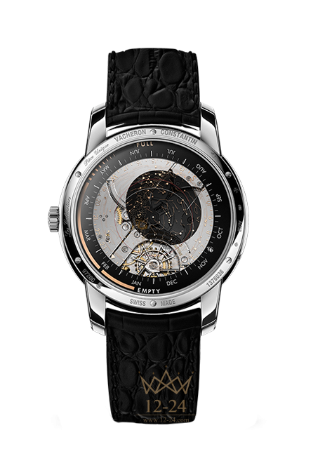 С обратной стороны этого шедевра часовой механики расположена карта неба Северного полушария. Данная карта с изображением созвездий, Млечного Пути, линий эклиптики и небесного экватора образована двумя сапфировыми дисками, наложенными друг на друга. Это запатентованное конструкторское решение открывает взгляду отделку калибра 3600. Мосты с тонким зернением и прозрачные камни способствуют максимально удобному считыванию звездного времени.