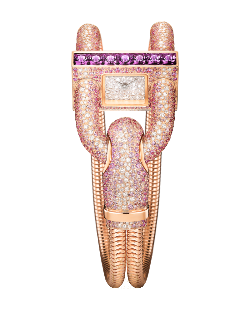 Циферблат Циферблат из розового золота, бриллианты круглой огранки, «снежная» закрепка; корпус с бриллиантами и розовыми сапфирами круглой огранки; суммарное количество бриллиантов - 251 весом около 1,25 карат, сапфиров - 1287 весом около 9,26 карат