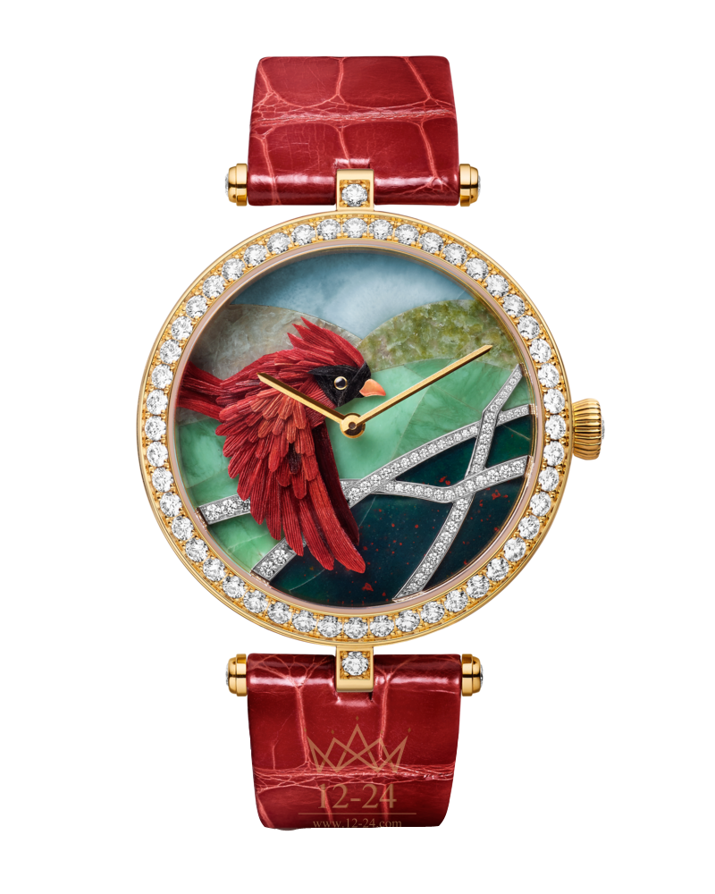 Циферблат Фоновый пейзаж выполнен в технике маркетри из ларимара, вайомингского нефрита, кровавой яшмы, жадеита и варисцита с бриллиантами круглой огранки, птица на основании из белого золота, миниатюрные перья, клюв из белого золота, миниатюрная живопись, глаз из белого золота с ониксовым кабошоном; общее количество бриллиантов - 169 весом около 2,93 карат