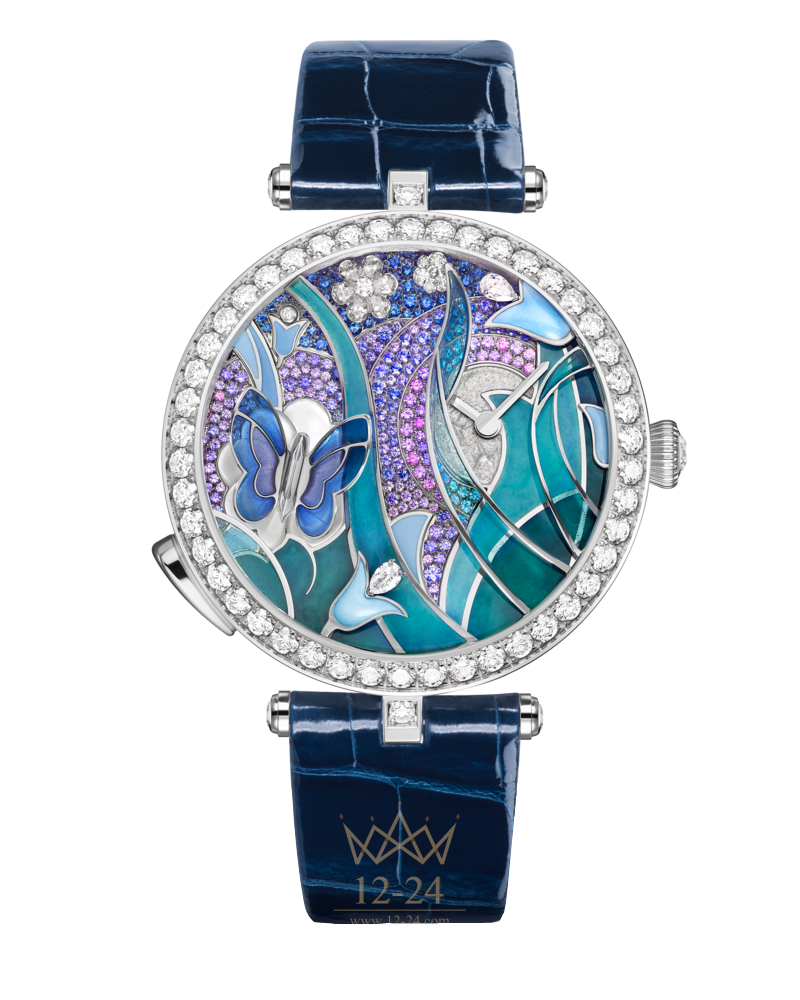 Циферблат На циферблате, выполненном в разных техниках эмали, расположилась бабочка, которая взмахивает крыльями от одного до пяти раз в случайном порядке или по запросу при нажатиии на кнопку; безель, заводная коронка и застежка инкрустированы 272 бриллиантами (~8,14 карат) и 287 сапфирами (~1,26 карат)