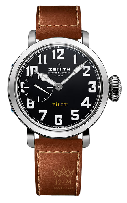 Задняя крышка с выгравированной надписью «Zenith Flying Instruments». Модель вдохновлена легендарными авиационными часами Zenith. Арабские цифры, полностью выполненные из люминесцентного материала SuperLuminova.