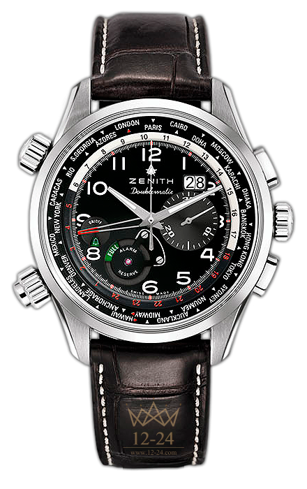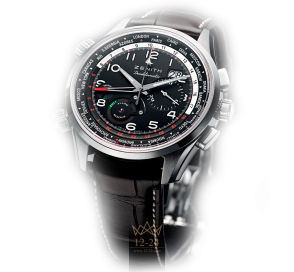 Модель вдохновлена легендарными авиационными часами Zenith. Арабские цифры, полностью выполненные из люминесцентного материала SuperLuminova. Большая дата, 24-часовой индикатор времени второго часового пояса и будильник.